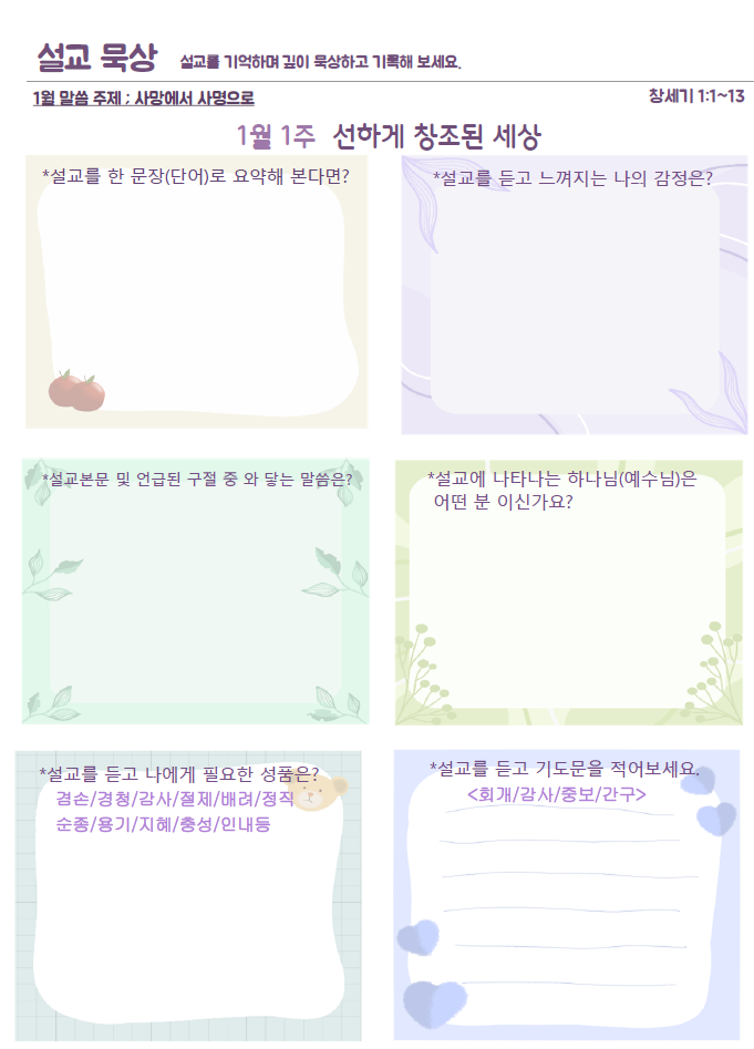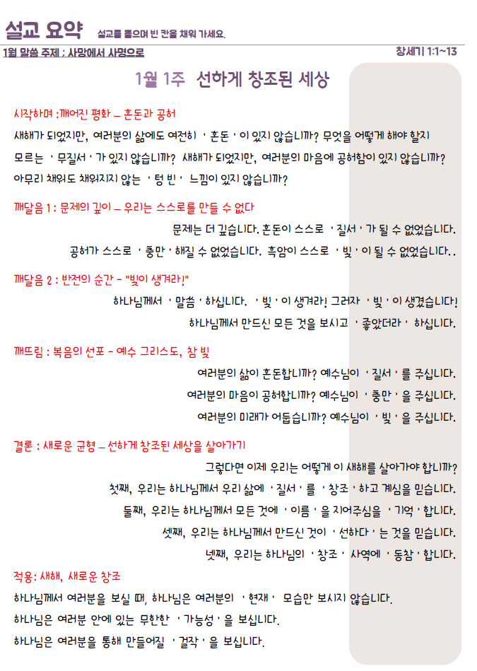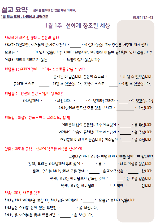 설교요약은 매 주일 목사님의 설교를 들으며 기록할 수 있습니다.