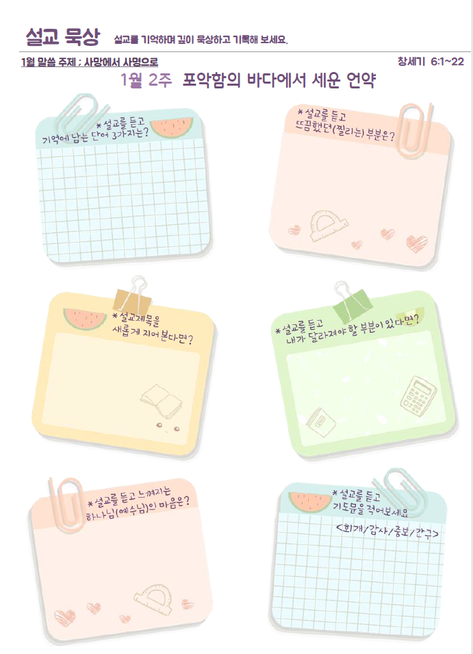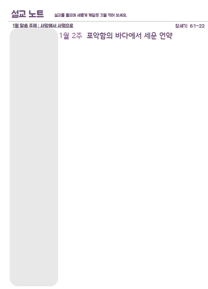 설교요약은 매 주일 목사님의 설교를 들으며 기록할 수 있습니다.