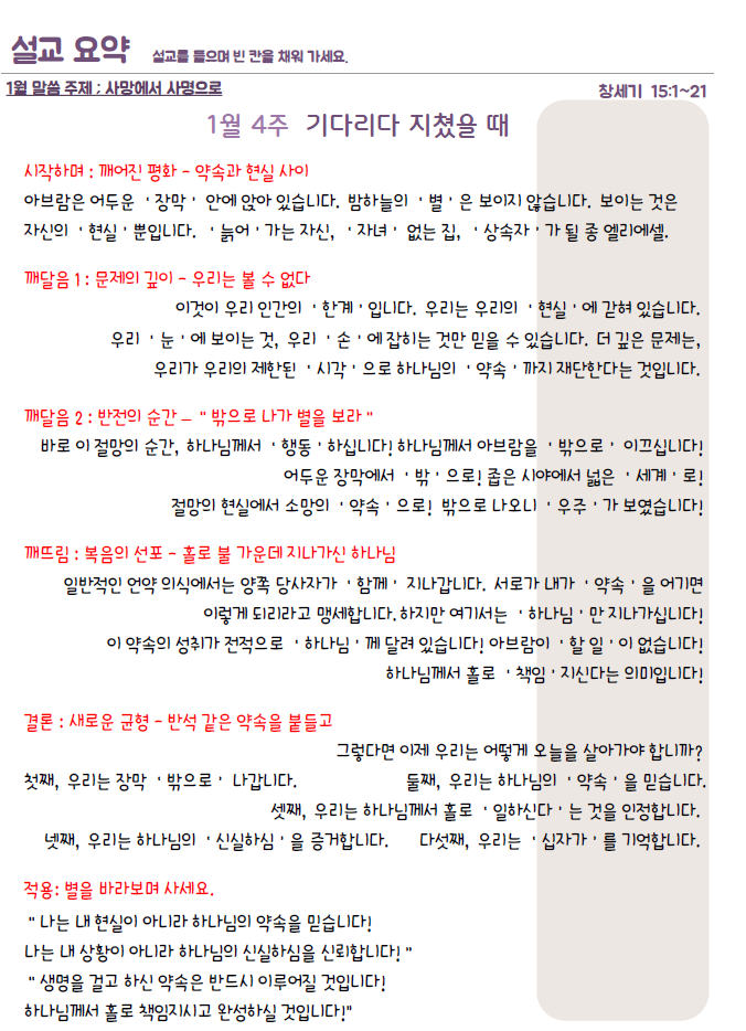 설교요약은 매 주일 목사님의 설교를 들으며 기록할 수 있습니다.