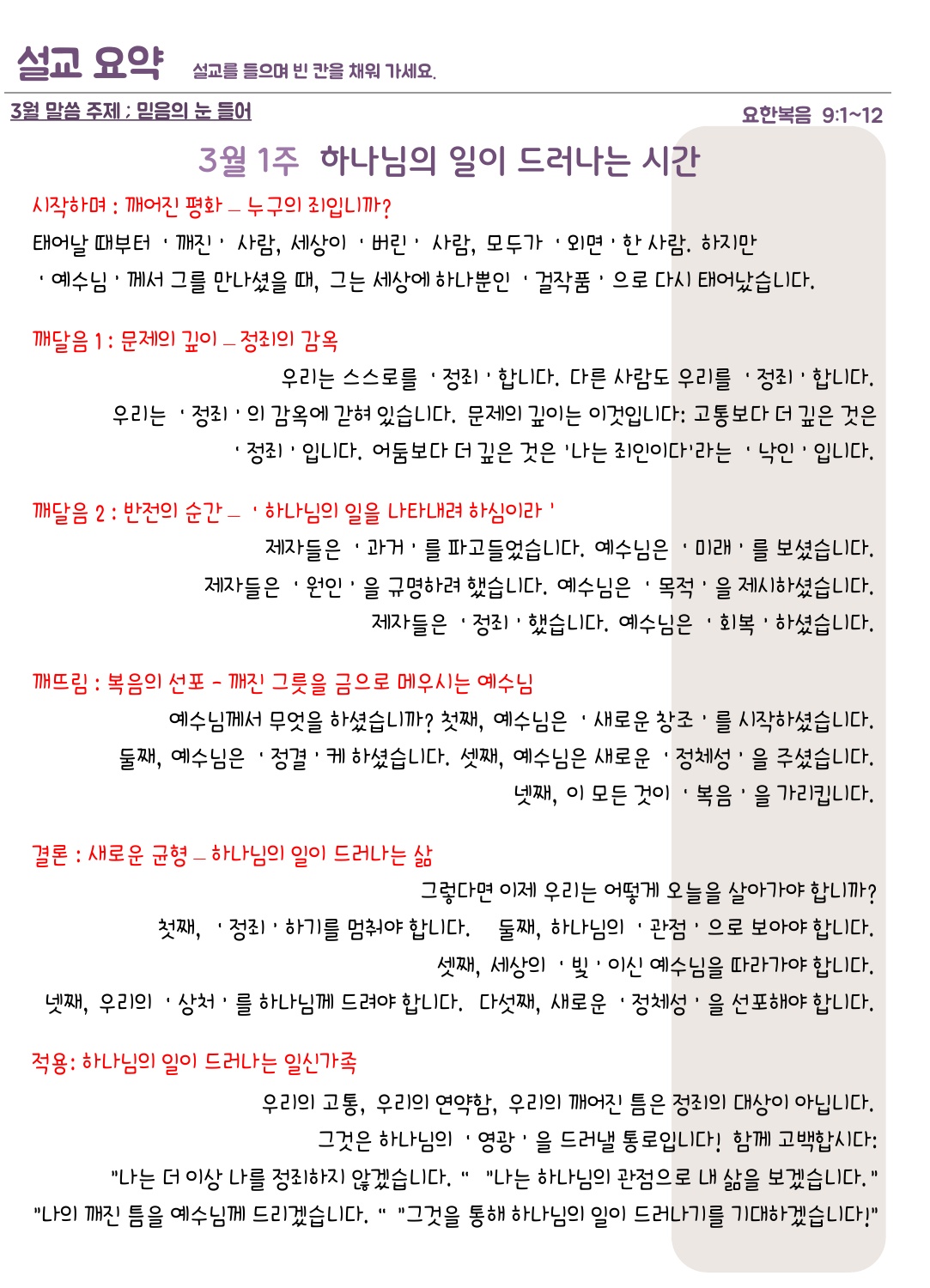설교요약은 매 주일 목사님의 설교를 들으며 기록할 수 있습니다.