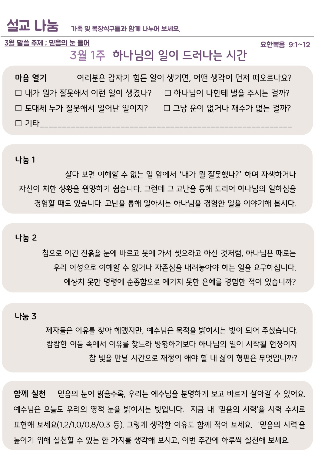 설교나눔은 가정과 목장에서 질문을 통하여 설교를 삶에 적용할 수 있습니다.