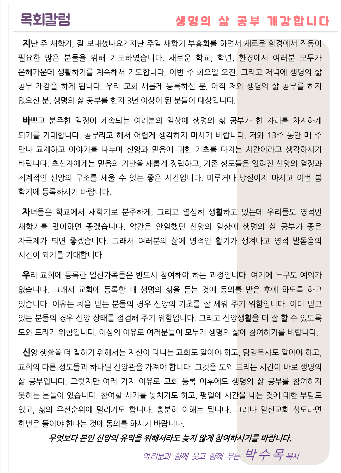 생명의 삶 공부 개강합니다.