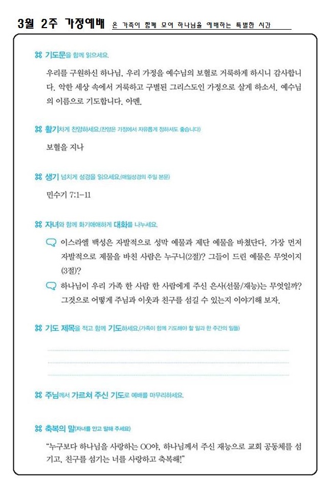 | 3월 2주 가정예배 순서지 | 운영자 | 2017-03-11 | |||