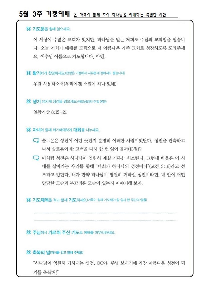 *가정예배지는 '매일성경'의 가정예배 순서지로 가정예배 드릴 수 있습니다.