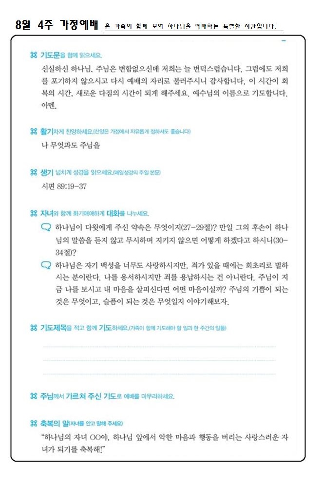 | 8월 4주 가정예배 순서지 | 운영자 | 2017-08-26 | |||