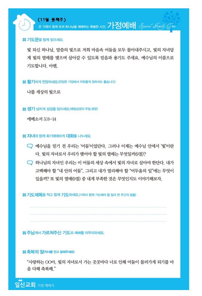 *가정예배지는 '매일성경'의 가정예배 순서지로 가정예배 드릴 수 있습니다.