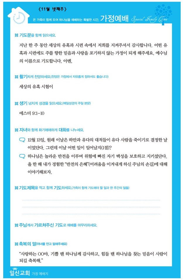 *가정예배지는 '매일성경'의 가정예배 순서지로 가정예배 드릴 수 있습니다.