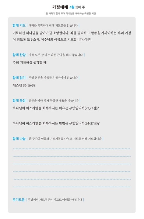*가정예배지는 '매일성경'의 가정예배 순서지로 가정예배 드릴 수 있습니다.