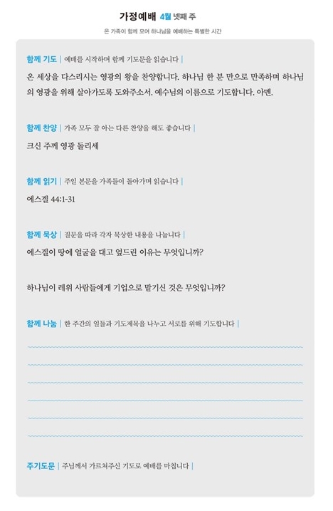*가정예배지는 '매일성경'의 가정예배 순서지로 가정예배 드릴 수 있습니다.