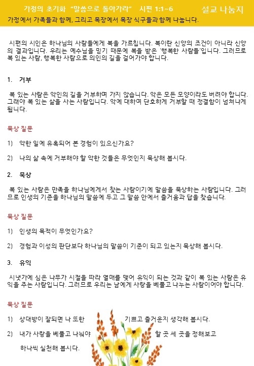 설교나눔은 가정과 목장에서 질문을 통하여 설교를 삶에 적용할 수 있습니다.