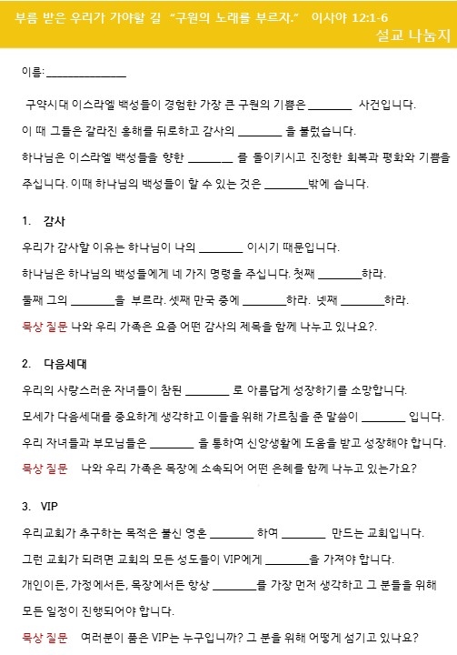 설교나눔은 가정과 목장에서 질문을 통하여 설교를 삶에 적용할 수 있습니다.