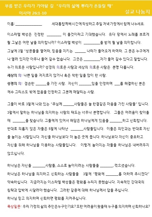 설교나눔은 가정과 목장에서 질문을 통하여 설교를 삶에 적용할 수 있습니다.