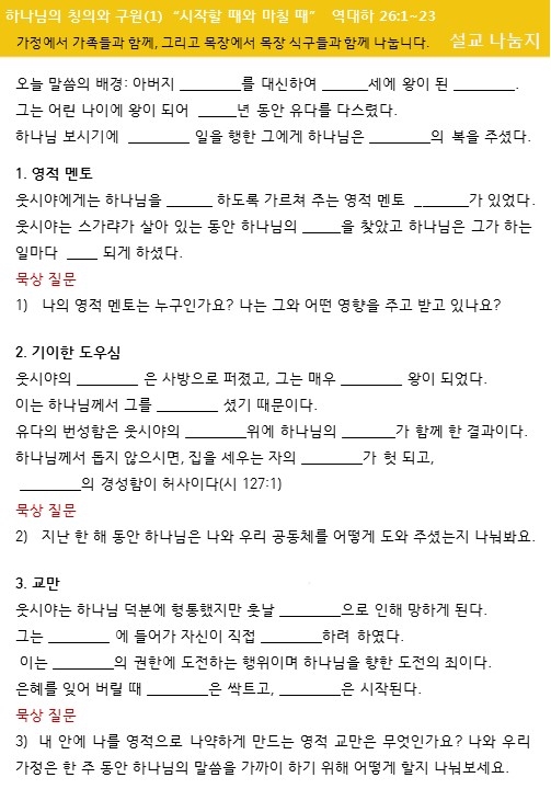 설교나눔은 가정과 목장에서 질문을 통하여 설교를 삶에 적용할 수 있습니다.
