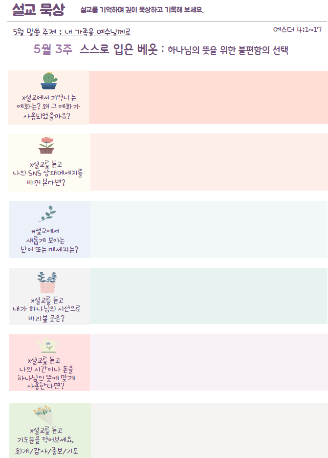 설교묵상은 하브루타 질문으로 들은 설교를 보다 더 깊이 묵상할 수 있습니다.
