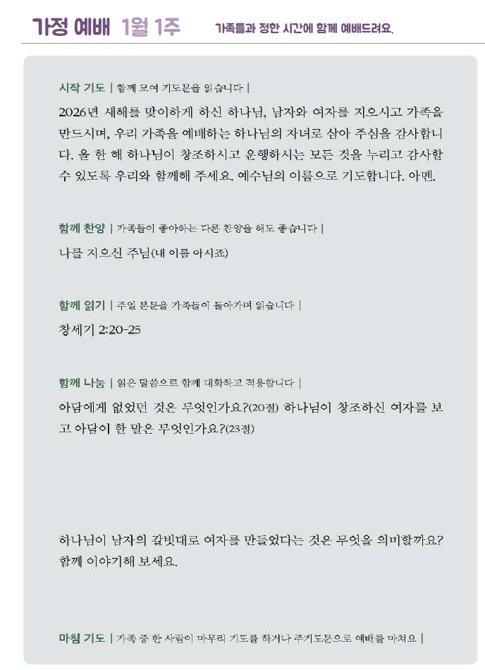 *가정예배지는 '매일성경'의 가정예배 순서지로 가정예배 드릴 수 있습니다.