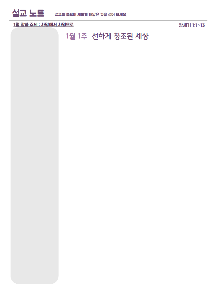 설교요약은 매 주일 목사님의 설교를 들으며 기록할 수 있습니다.