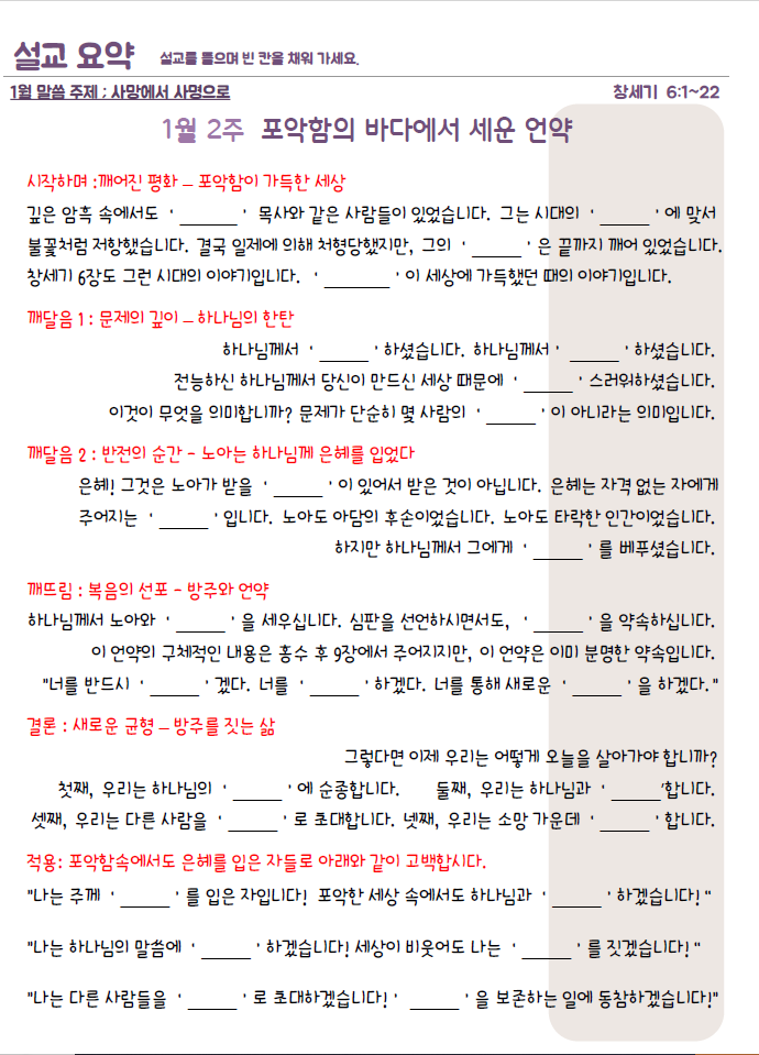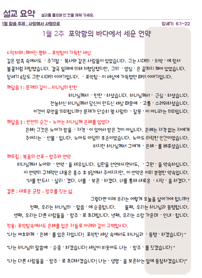 설교요약은 매 주일 목사님의 설교를 들으며 기록할 수 있습니다.