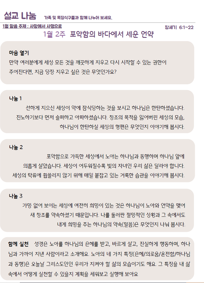 설교나눔은 가정과 목장에서 질문을 통하여 설교를 삶에 적용할 수 있습니다.