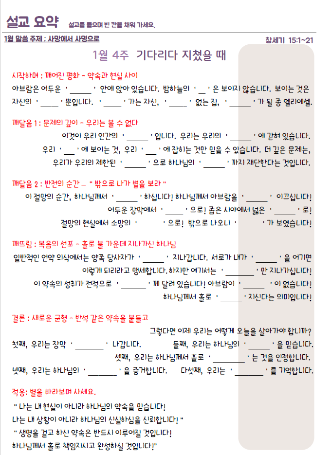 설교요약은 매 주일 목사님의 설교를 들으며 기록할 수 있습니다.