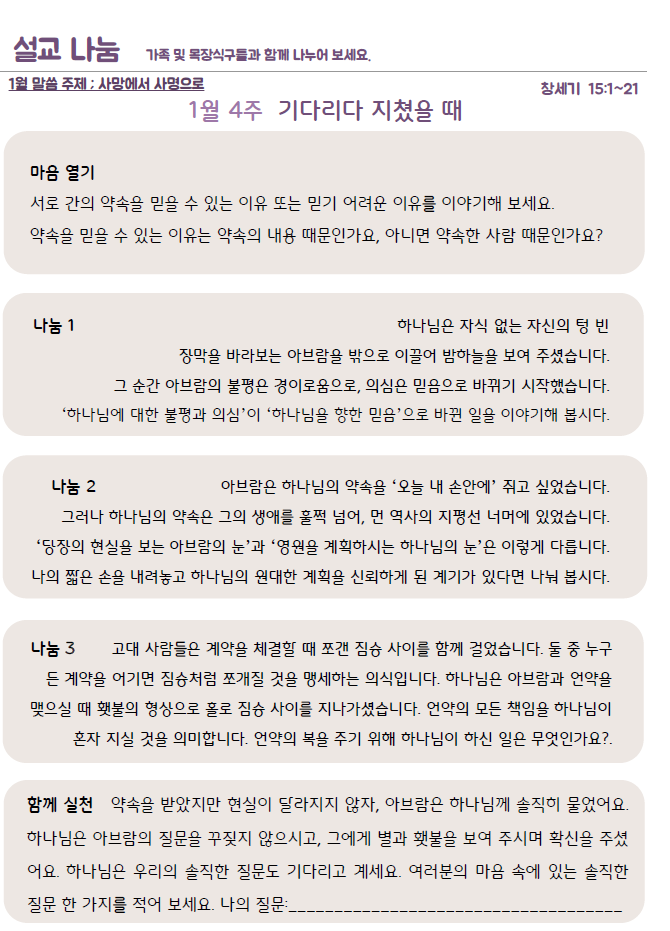 설교나눔은 가정과 목장에서 질문을 통하여 설교를 삶에 적용할 수 있습니다.