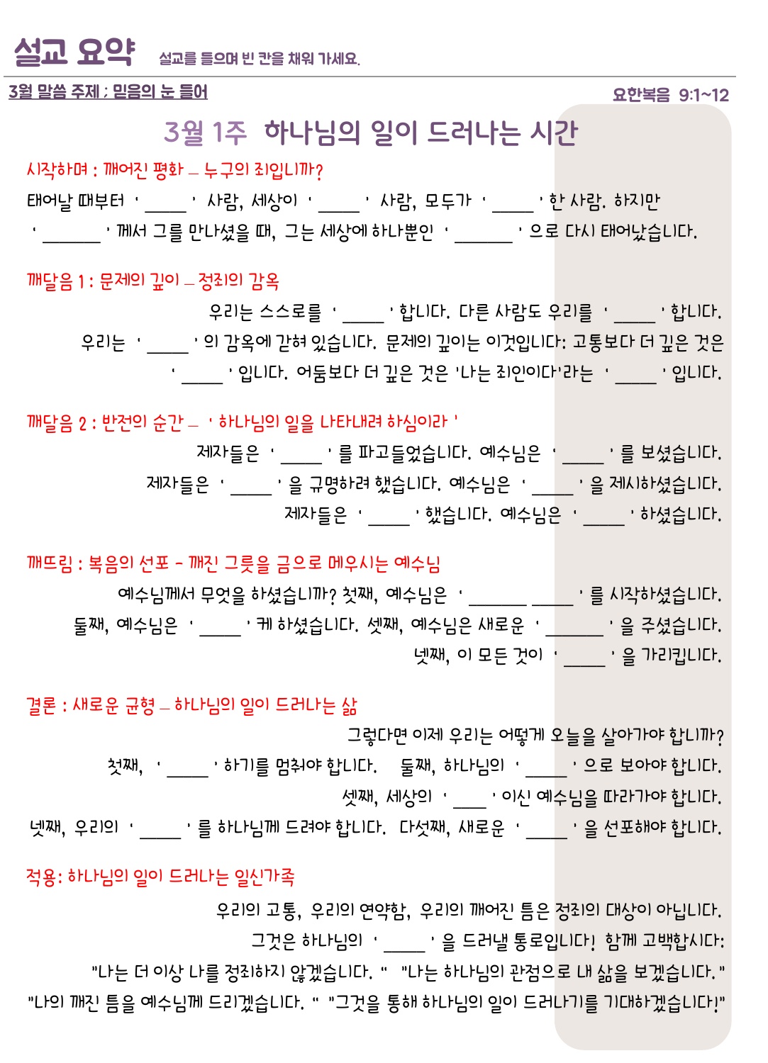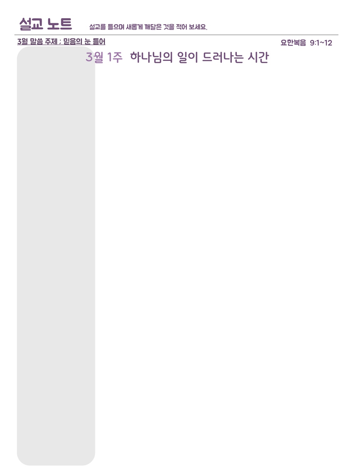 설교요약은 매 주일 목사님의 설교를 들으며 기록할 수 있습니다.