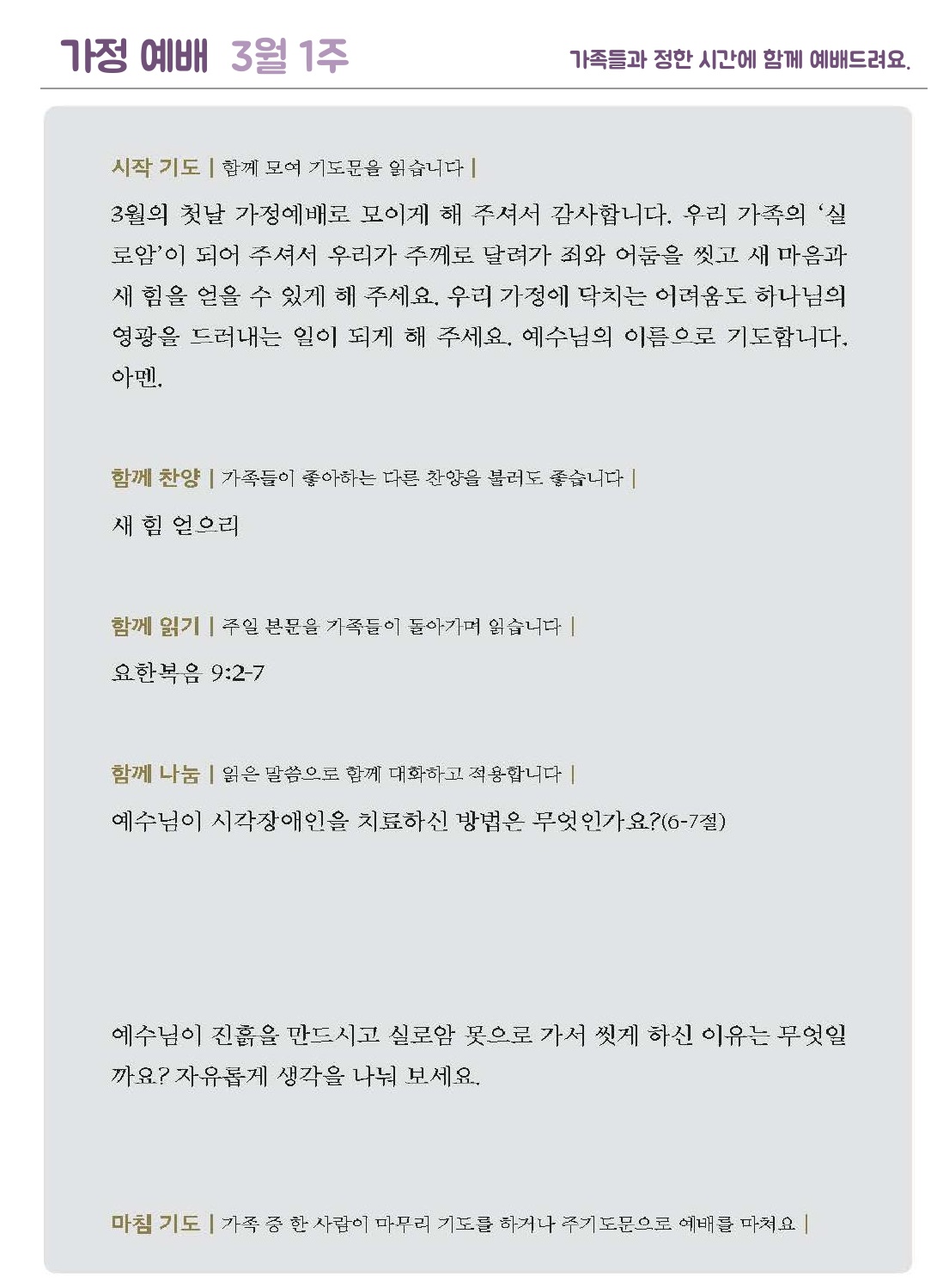 *가정예배지는 '매일성경'의 가정예배 순서지로 가정예배 드릴 수 있습니다.